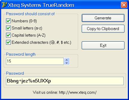 You can choose which parts your password should consist of (number, small, capital letters and special characters) and also the length of it. Xteq TrueRandom then generates a truly random password for you.